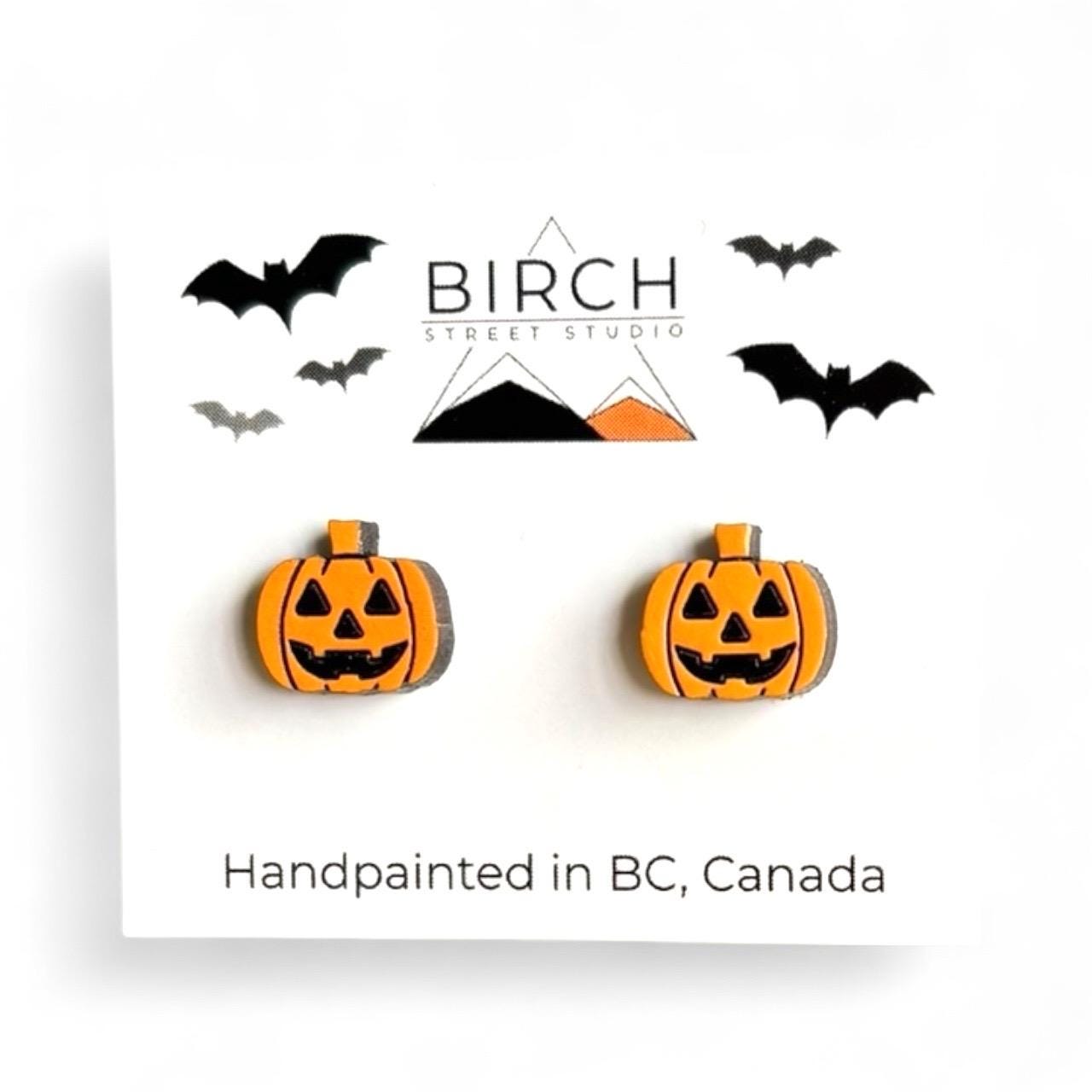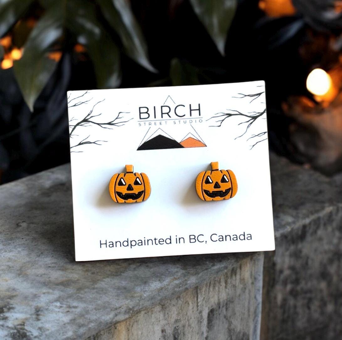 Jack O' Lantern Earrings, Halloween Stud Earrings, Hand Painted Wood Post Earrings, Halloween Pumpkins, Hypoallergenic,