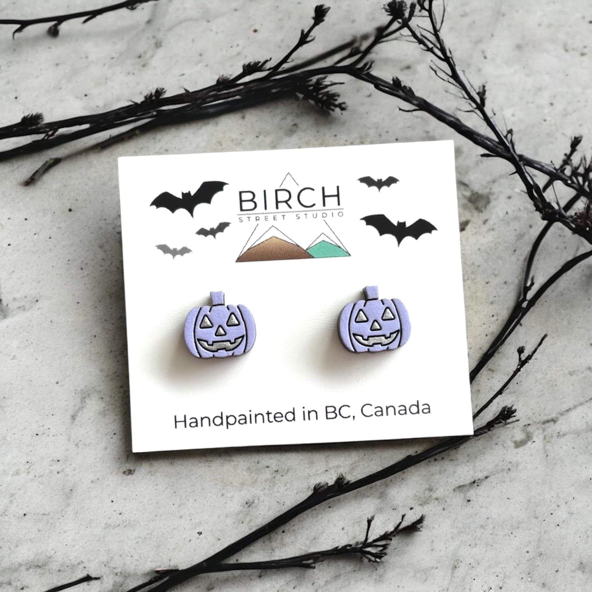 Jack O' Lantern Stud Earrings, Pastel Halloween Pumpkin Earrings, Pink Pumpkin Studs, Light Purple Pumpkin Studs, Hand Painted Wood Earrings